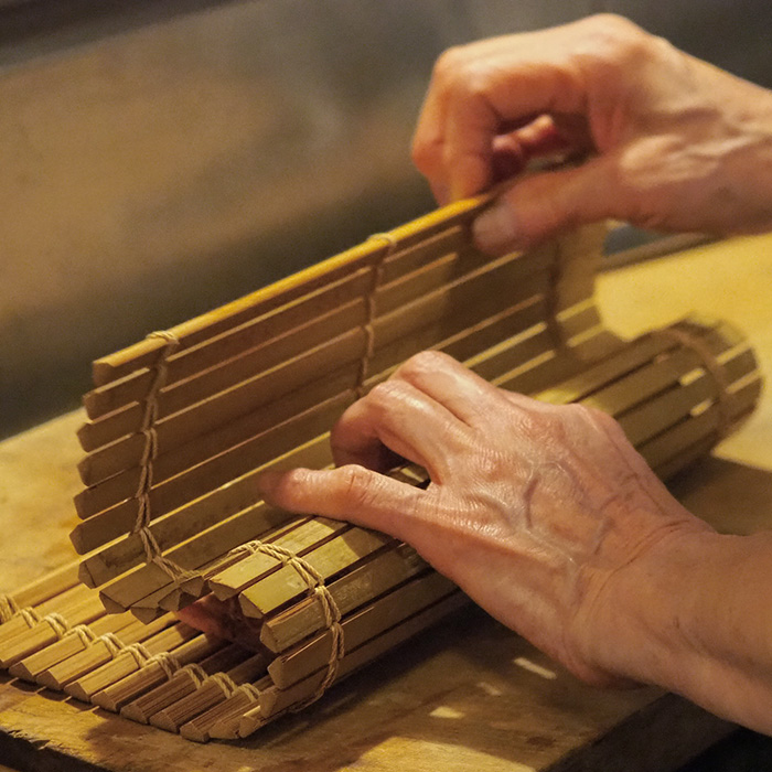 ご紹介するオニス(鬼すだれ)は九州地方の竹を使い職人によって手作業で仕上げられている、いまでは貴重な国産・手作りの巻きすです。オニスは伊達巻きの成型に欠かせない道具で、まるで鬼の歯のように見える鋭い三角形の竹ひごが伊達巻き独特の波模様を生み出します。太さのある竹ひごを一本ずつ丁寧に削りだしたあと糸でつなぎ仕上げていきますが、特に傷みやすい両端は二重で編むことで強度を持たせ、しっかりとした作りに。