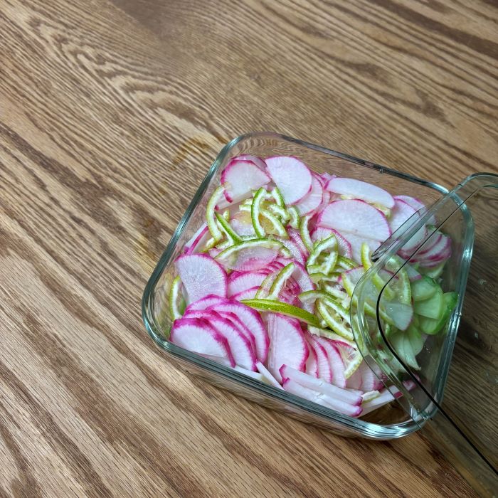 かぼすといったらさんまですが、さんまにかける以外の使い道はないかしら...と思い作ってみた大根のさっぱり漬け。半月切りにした大根に塩、砂糖、かぼすの果汁、かぼすの皮の千切りを和えるだけで、かぼすの爽やかな香りのちょっとした箸休めに最高な一品になります。浅漬けやピクルスを作るときの相棒はイワキ パック&レンジ グリーン 800ml。この大きさが1週間分くらいの作り置きには丁度良いサイズで、ガラスの容器は野菜がきれいに見えて料理のやる気も◎です!