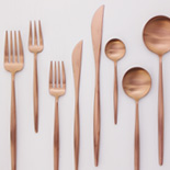 美しい赤みを帯びたコッパー色がテーブルに温かみと洗練さをもたらすムーン・アンバーゴールド。ゴールドとはまた趣が異なり、アンティークのような風合いが素敵。洋食器だけでなく和食器とのコーディネートも楽しめるシリーズです。