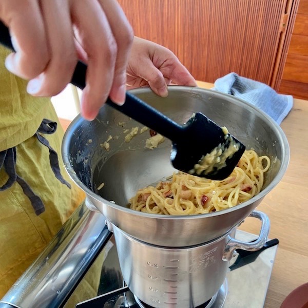 ソウのスパチュラは先端が根元よりも細いフォルムなので、スパゲティーをソースに絡める時にすごく混ぜやすいんです。柔らかすぎず、硬すぎないコシのある先端は混ぜる時にもソースや具をさらう時にも重宝します。余談ですが、ボウルで混ぜて作るカルボナーラの場合、卵を常温に戻しておくともったりとしたソースになるのですが、麺を入れる際に卵液の温度が低いと混ぜてもソースがシャバシャバに。その場合はパスタの茹で汁の蒸気でボウルを温めながら混ぜるともったりとしたソースになります。