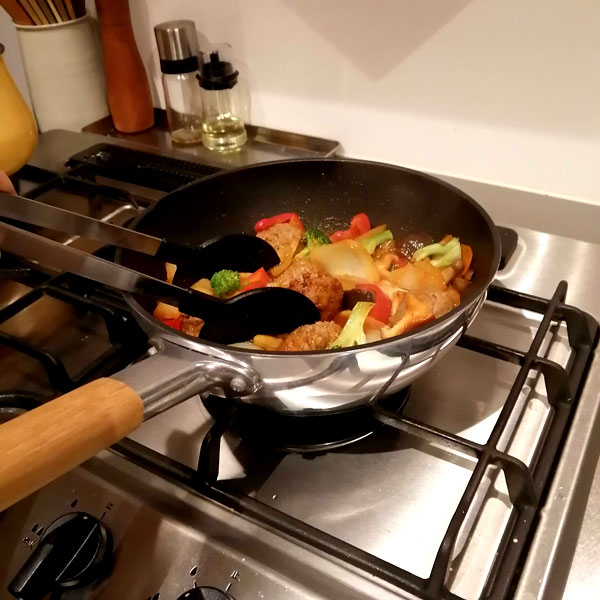 鉄フライパンさえあれば、なんでもできると思っていますけど、この軽さとフッ素加工の扱いやすさは、ぱぱっと簡単に作りたい時は気楽に使えて助かります。アンバイのフライパンのこの深さが絶妙で、中華鍋ほど深くもなく、フライパンほど浅くもなくで色んなお料理に使えるんです。木のハンドルも持ちやすいようにゆるやかな逆三角形のような形で、使いやすさを考えられて作られてるなーと思わせてくれるフライパンですよ。