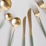 上品に輝くゴールドと淡いセラドングリーン(青磁色)のコンビネーションが新鮮。シンプルながらもひとひねりあるカラーリングはほど良い個性を放ち、日々の食事シーンを優しく彩ります。カトラリーは脇役と考えがちですが、このカトラリーは料理や器を引き立てドレスアップしたテーブル作りにひと役買ってくれる主役級の存在感です。