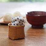 大らかな手描きの風合いを感じさせる文様を描いた、「手描きの風合いの」かや織ふきん。このあられは揺らぎのある円を不規則に散りばめたあられ模様を捺染(なっせん)し、「手描きの風合いの」かや織ふきんに仕上げました。