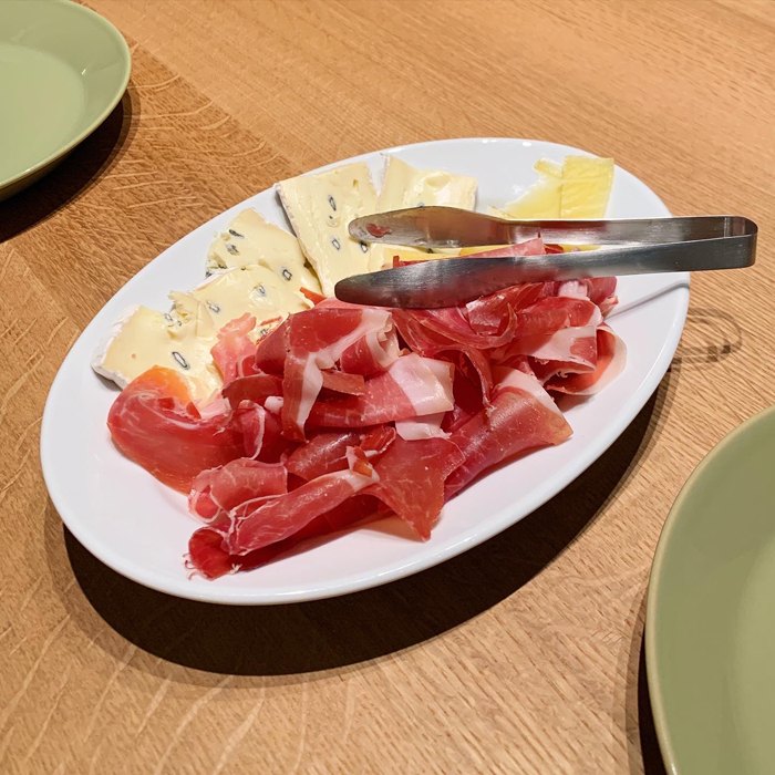 コンテのおてがる薬味トングの特徴は「軽い使い心地」。開閉が力まずにできるので生ハムをパックから剥がし取るなど、繊細な作業に向いています。そして、盛り付けた生ハムと一緒にテーブルに。シンプルなデザインでコンパクトなサイズ感は食卓での取り回しもしやすく好印象。開閉が楽な分、力んだり、大きな食材を掴むには不向きに感じますが、お弁当を詰めたりするのにもピッタリなトングだと思います。