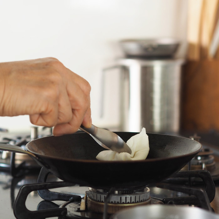 そして、ネーミングのまかない。フチの巻き込みをなくしたデザインから付けられたもので、よくあるフチのくるんとカールした巻き込みをなくすことで、汚れがたまらずいつも清潔。さらに嬉しいことに、フチのそり返りのおかげで、卵液などを注いでも液だれしにくく、注いだ後にたらっと垂れることがありません。どこにも凹凸がない滑らかなデザインは洗い物もしやすいですよ。