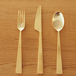 ヘアライン仕上げのステンレスに24金メッキを施し、上品な風合いに仕上げたゴールドのカトラリー。使いつづけるうちに色味が落ち着いていきますが、メッキがはがれる心配はございません。いつもと違う新鮮さをプラスしたいとき、大切な方たちを招くとき、このカトラリーがあなたらしい食卓作りにひと役買ってくれることでしょう。カフェやレストランなどでも広く使われており、デザイン性だけでなく耐久性にも定評があります。