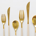 マットゴールドの輝きをワントーン落ち着かせているのが、温かみのあるアイボリーのハンドル。柔らかなラインを持つミオ・アイボリー マットゴールドならカジュアルなシーンからいつもよりドレスアップしたい日まで、テーブルに新鮮な華やぎを添えてくれるはず。