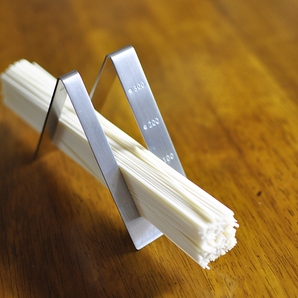 計ったパスタの置き場が欲しい、というアイデアから生まれたユニークな三角形の形をしたパスタメジャー。スリット部分にパスタを置くとサイドに刻まれた50g、100g、150g、200g、250g、300gの目盛りによって0.5〜3人前のパスタを計量することができます。