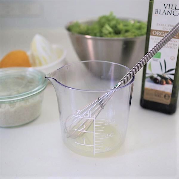 このレモン搾り器の下部分はメモリ付きのサーバーになっているので、レモンを搾ったらボウルに移し替えたりしなくても、搾りたてのレモン汁を使ってドレッシング作りが簡単にできちゃいます。我が家で作るドレッシングはレモン汁に対して倍量のオリーブオイル、塩少々と胡椒をぱらり。レモン汁がちょっと酸っぱいかなというときは、はちみつもほんの少し追加するとマイルドになりますよ。わざわざドレッシングを買わないでも、この簡単にできるドレッシングでサラダもおいしく食べられます!
