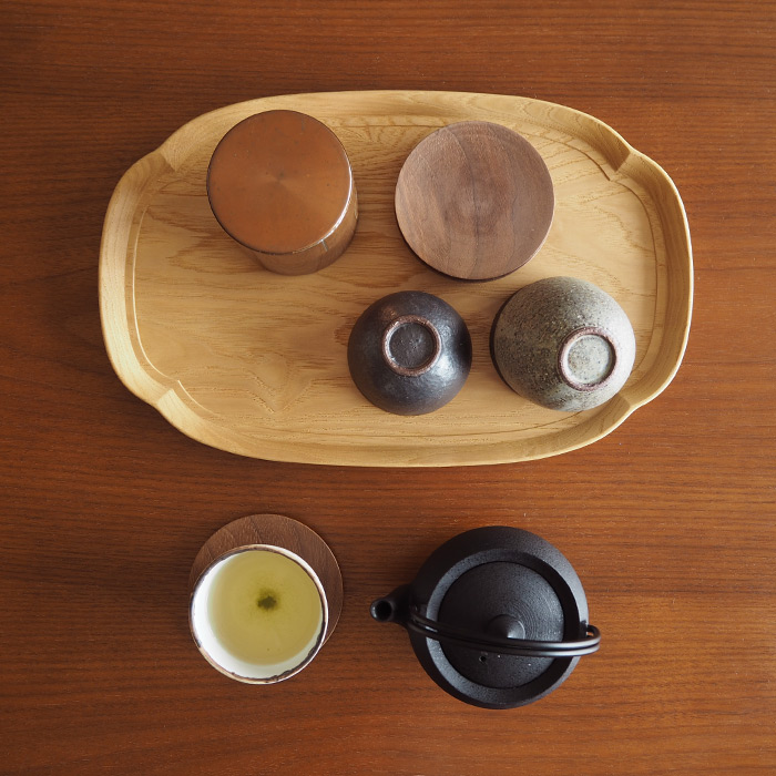 国産広葉樹の栗材で作られた長木瓜盆(ながもっこうぼん)。家紋にも使われている縁起の良い木瓜のカタチをモチーフにしています。どこか空に浮かぶ雲のようにも見えるゆったりとした長方形のお盆は食卓で無駄なスペースを作らず、器のセッティングもしやすいのが特徴です。長木瓜盆は一枚板をそのまま削り出して作られています。大きく目の詰まった材を取り出すには80〜100年の成長木からでないと何枚も取れないそう。市場の中でも100本に1本あるかという貴重な材ということでとても贅沢な一枚です。