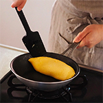 実際に使ってみると食材の滑りの良さを実感します。まさにするん、つるんと滑るから汚れ落ちも抜群。また、鍋肌やハンドルの角度はあおりやすさを考えて作られているため、調理中に負担を感じません。デメリットというほどではありませんが、軽さが魅力のアルミフライパンながら、このフライパンは板厚があるためそこそこ重量がございます。
