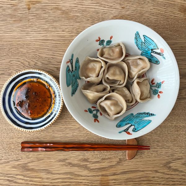 九谷の鮮やかなブルーをまとったおおらかな鳳凰と、赤色のバランスがよく、他にはない魅力がある浅鉢です。最も縁起の良い鳥とされている鳳凰がちょっととぼけた表情で描かれていて使うたびに癒されます。今日は代々木の按田餃子で買ってきた餃子で一人ランチ。少な目に盛り付けてもかわいいし、どーんと盛り付けても華やかな器です。