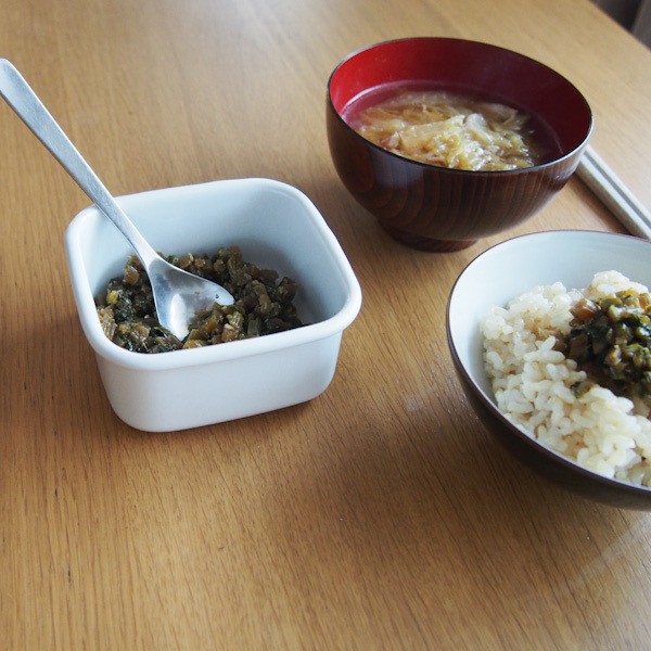 野田琺瑯のホワイトシリーズは数サイズ活躍しているのですが、一番使っていると思っていたレクタングル深型Sといつの間にか同じ数だけ所有していたのがスクウェアSサイズ。そんなにしょっちゅう使うわけではないけれど少量常備しておきたい白みそや無塩バターを保存するのに2つ使用していましたが、ちょっとした残り物などを保存しておく用にもう1つ購入。かぶを買うときは葉っぱを刻んでごま油でいためてしょうゆで味付けするふりかけを作ることが多いのですが、その保存にぴったりです。