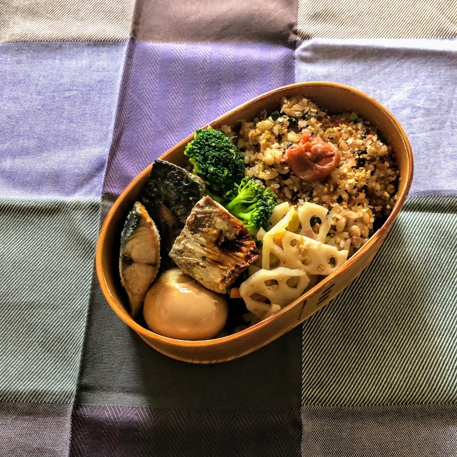 プロキッチンスタッフに教えてもらったひじきご飯、それまでは炊き込みご飯はいろいろ準備して…と思っていましたが、ひじきや干しシイタケ、ゴマ、豆など乾物を前の晩に水につけておいて、朝お米に塩昆布をプラスして炊くだけと教わってからは気軽に作れるようになりました。お醤油を少々入れる時もあります。曲げわっぱにひじきご飯、味玉とすっかり茶色いお弁当になりました。