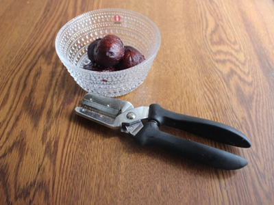 小学校の給食で食べた栗ごはんがとてもおいしかったらしく、スーパーで売っているのをみつけたこどもに生栗を購入するようにねだられ、栗の皮むきに初挑戦しました(いままでは炊き込みごはんの素を使ってごまかしていました)。包丁でむくのは絶対大変だと思ったので、栗くり坊主を急いで購入。鬼皮も渋皮も一緒にむけて、思わずおお~っとうなるほど楽に栗の下ごしらえができます。それだけ鋭利な刃なので取りかかる前の取り扱い説明書の熟読は必須です。けがをしないように、栗を持つ手には軍手をはめてのぞむのをおすすめします。栗だけでなく里芋の皮むきにも使えますよ。