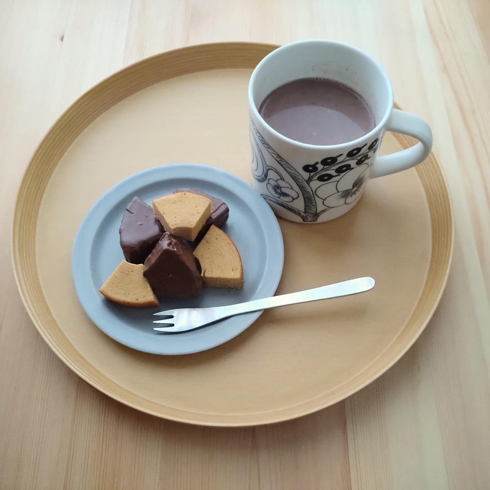 柳宗理のヒメフォークはちょっとしたお菓子や果物に使いやすいサイズなので、毎日のように使っています。柳宗理デザインの道具やカトラリーを少しずつ集めていて、ヒメフォークはすでに〇十年も使っていますが、飽きることなく壊れることなくおばあちゃんになっても使っていると思います。市販のバウムクーヘンにラム酒を含ませて溶かしたチョコレートをまとわせてみました。ちょっと大人なデザートです。