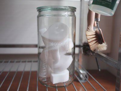 今まで大量にピクルスを作ったり、お菓子を入れたりするときに使ってたこのサイズ。だけど、底が深くてちょっと取り出しにくいので、我が家ではお蔵入りしてました・・・。 それが最近、お掃除用にこんなかわいいスポンジを見つけたので、この瓶に入れて収納することにしました。かわいくてたくさんストックしたいので、このサイズはとっても重宝しています!
