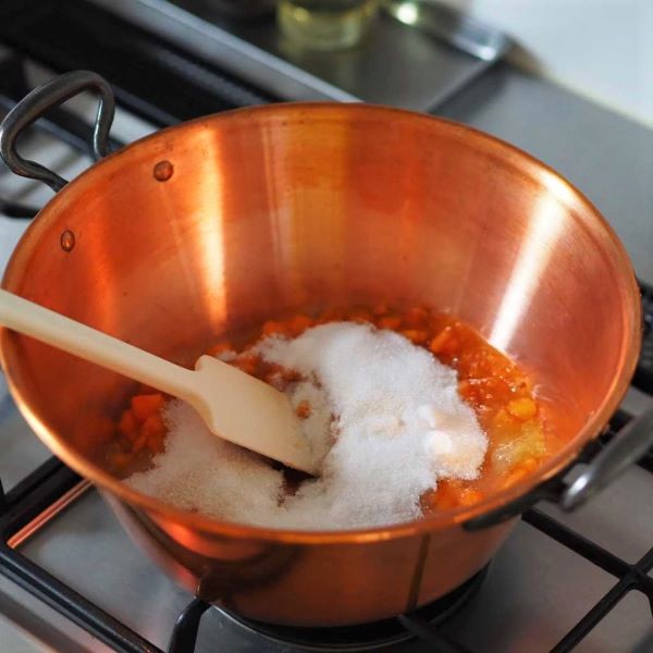 お年賀でいただいたたくさんの柿。柿は大好きなのでいっぱい食べましたが、残っていた柿が柔らかくなってきました。私はやわらかい柿もデザートのようで好きなのですが、保存できるようジャムにしました。この銅鍋があると短時間で出来るので色がとってもきれいな上に、フルーツの香りもしっかりしてほんとに美味しく出来ます。今回はブシュカン(みかんの一種)の果汁も入れた所、ほのかに香る柑橘がさっぱりとして美味しく出来ました。フルーツは1年中あるので季節のフルーツをジャムにしてプレゼントにも喜ばれますよ。