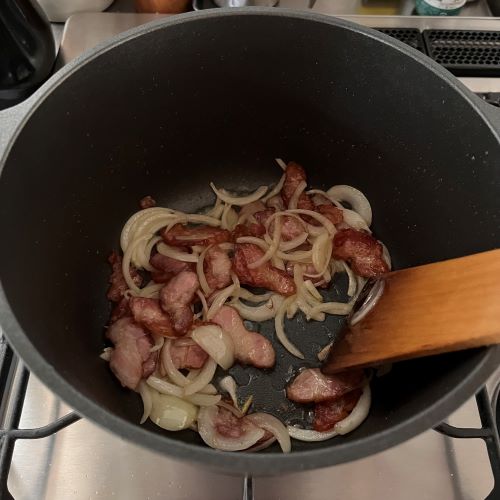 ほんとうにくっつかなくて調理が楽な味わい鍋。しかもいつもより少ない水で煮物などもおいしく出来て、重宝してます。今回は深鍋の良さとくっつかない良さを活かして、カルボナーラを作ってみました。ベーコンをカリカリに炒める時も鍋が焦げ付かないのと深さがあるから油跳ねもしにくい。そして、ソースもここで作ってパスタを絡めれば、お鍋1つでできちゃいます。たっぷりのカレーもできますけどこんな風にパスタもできちゃったりする便利なお鍋です。