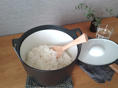 家族が「炊飯器より美味しい!」と喜んでくれるので、去年の夏くらいからお鍋でごはんを炊いています。我が家はラウンド22cmで2合炊きますが、容量的には余裕があります。ストウブで炊くと土鍋よりしっとり炊きあがるように思うので、少し長めの時間設定にしています。