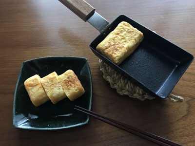鉄に慣れていない方にも安心な使いやすさと思います。油馴染みが良いのでこびり付きにくく、熱伝導率が良いのでテンポよく玉子焼を作ることが出来ます。間違えて小さい方を買ってしまったのですが、家族揃っての食事の機会が少ない我が家にはちょうど良かったみたい。画像は卵2個で焼いたもの。焼きたてで食べきりサイズの玉子焼が好評です。