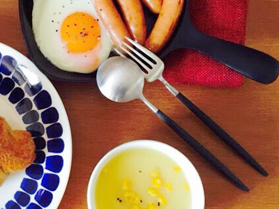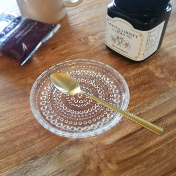 カトラリーはカイボイスン派ですが、ティースプーンは別。この赤よりのゴールドがお気に入りです。喉が弱いので毎日はちみつコーヒーを飲んでいるのですが、はちみつを金色のスプーンで掬う高揚感、たまりません。プロキッチンでクチポールを取り扱い始める時、悩んだのがカタカナの表記。ポルトガル語の発音だとキュティポルだったりクティポゥフだったりで、聞き手によって違うんです。でも、英語に堪能なスタッフの「発音に忠実だとマクダーナルみたいな事になるよね…」の一言でクチポールに決定。そして現在、見事に市民権を得ました!ここにも歴史あり、ですね。