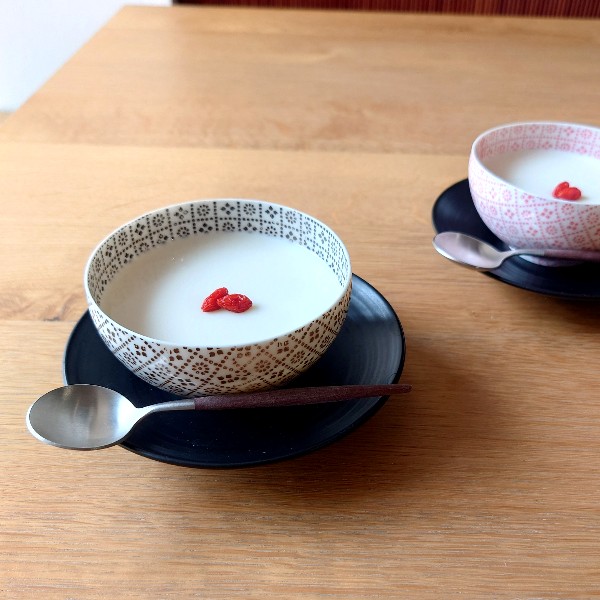 この日のおやつは杏仁豆腐。カルディのパンダ杏仁を溶かしたら丸直製陶所の陶碗ちょうど二つ分になりました。「エッグシェル」と呼ばれる磁器は窓辺でかざすと太陽の光を感じるほどの薄さ。手に持ったときのひんやり感と器の薄さが相まって食べる前から涼しい気分になれました。白山陶器の陶茶托に合わせてみたらサイズがぴったり。ご一緒にどうぞ♪