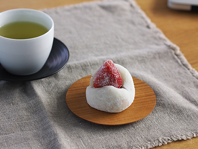 イチゴ大福に目がない私。イチゴの季節しか食べれないと思うとお気に入りのお店の販売期間をチェックして必ず買いにいきます。そして至福のイチゴ大福タイムにぴったりなのがこの木の丸いお皿。大福やねりきりなど和菓子を頂くのにぴったりです。そのままパクッといきたいところですが、丁寧にお茶を入れて食べると、幸せ~