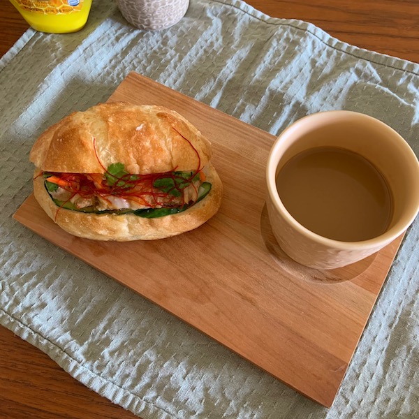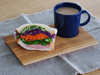 在宅勤務でささっとランチするときや、ゆったりおうちカフェ気分を味わうときに活躍するのがこのカフェトレイ。スープや飲み物を入れたマグを置くのにちょうどよいくぼみや、持ちやすくするために斜めにカットした縁などプロキッチンスタッフのこだわりがつまっています。夜が長くなるこれからの季節には軽いおつまみとワイングラスで晩酌用としても使えますね。今日のお昼はカタネベーカリーのバゲットサンド。木の温もりあふれるカフェトレイでほっと一息しませんか?