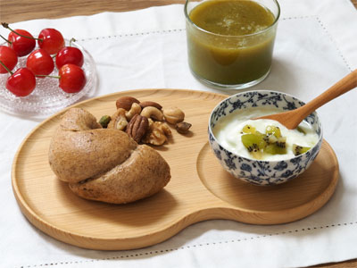 とにかく形がかわいくて、ひとめぼれしたビーンズプレート。朝食はパンが多い我が家では、毎朝登場します。木のプレートは軽くて温かみがあって好きです。お豆の形と丸いくぼみがかわいくておやつの時間にも使ってます。