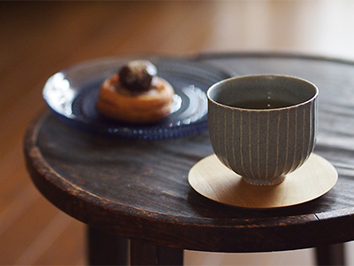陶器市へ行くとついつい買ってしまう湯のみ。なかなかコレ!っという茶托が見つからず、ずっと麻布を敷いていました。こってこての「和」も好きなのですが、若手の作家さんの湯のみには木のプレートがちょうど良い感じ。やっとお気に入りの茶托を見つけました。