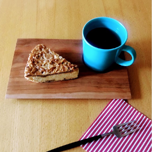 ちょっと休憩したいときに、木のカフェトレイをよく使います。今日はいつか食べようと思って冷凍しておいたアーモンドタルトです。お皿の代わりにもなるし、そのまま場所移動もできるのも重宝しています。夫はこのトレイにおつまみとお酒をいそいそと用意して、嬉しそうにベランダに持って行ってひとり楽しんでいました。今度真似してみようと思ってます。