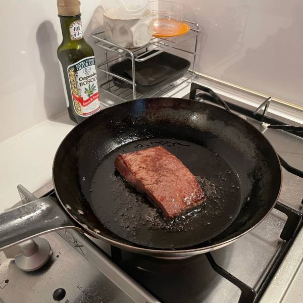 うちのフライパン、玉子焼きなど全て鉄製で揃えているのですが、中でも一番美味しさに違いがでるのは、ステーキと牛肉の鉄板焼き。ちょうど土曜日に近所のスーパーで格安和牛ステーキを買ってきたので、今回の写真を撮りました。油慣らしがちゃんとできていれば、くっつかないし、こびりつかないですよ。外側は程よく焦げ目がつき、中はジューシー、完璧な和牛ステーキができました!山田工業所の鉄フライパン、毎日愛用中です。