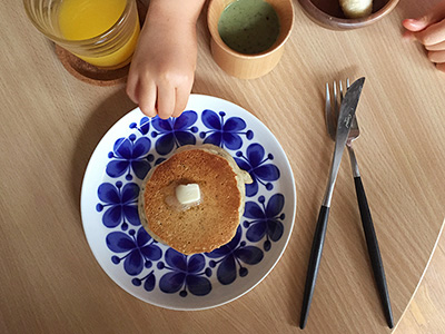 「日曜の朝ホットケーキミックス」という名のホットケーキミックスを手に入れ、素直に日曜の朝を待って焼きました。小ぶりで素朴な仕上がりのホットケーキには愛らしいモナミブルーがピッタリ。「かわいいー」と娘が気に入った様子。この時を境に娘専用のお皿となり、プラスチックのお皿は卒業しました。大切に使ってね。