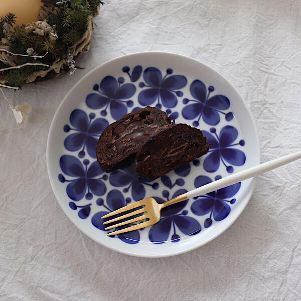 この時期になるとクリスマスのプレゼントやディナー、ケーキはどうしようかといろいろ気になりますが、私がクリスマス前に楽しみにしているのがシュトレン。毎年いろいろなお店のシュトレンを試しています。今年はお気に入りのパン屋のショコラシュトレン。濃厚なので一日少しずついただいています。そんな一日の楽しみのシュトレンに合わせたのは、鮮やかなブルーのモナミプレートとGOAホワイトのマットゴールドのデザートフォーク。クリスマスの食卓にも映える組み合わせです。