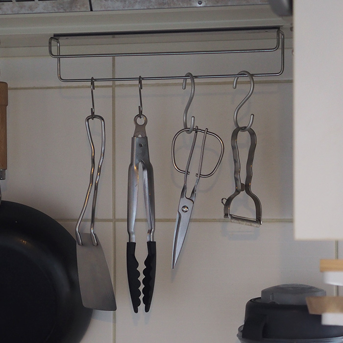スタッフ岩谷のコメントを見て、私もこの壁付けふきん掛けをキッチンツール掛けにしたところ超便利!この2段しかも段違いのバーの作りにより、今までの1本バーのスペースで倍のツールを掛けることができるのです。もちろんこちらはふきん掛け。耐荷重500gですので、調子に乗ってツールを増やすとガシャーンと落ちてしまうので要注意。念の為キッチンバサミのような先の尖った刃物類は掛けないようにしています。奥(下段)に重め、手前(上段)に軽めのツールを掛けるとバランス良いようです。