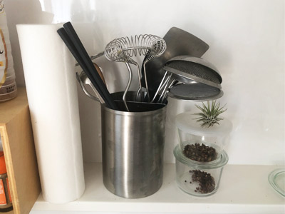ツールスタンドって、ぱっと取る時にスタンドごとグラっとすることありませんか?それは、底の方でツール同士が絡まり合ったりしているから。家事問屋のツールスタンドは、間口が広く入れやすいのに、仕切りがついているので、絡まらりづらいんです。頭でっかちなお玉やヘラを入れても安定感があり、指紋や汚れが目立ちにくいヘアーライン仕上げなのも気に入ってます。