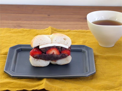 あんこ+バター+いちご。おいしくないわけがない組み合わせ。ベーグルだから洋だけど、あんこだから和。どんなものも受け止めてくれるカラーが使いやすいです。飲み物はほうじ茶を。ロータスカップ クリームに入れて。