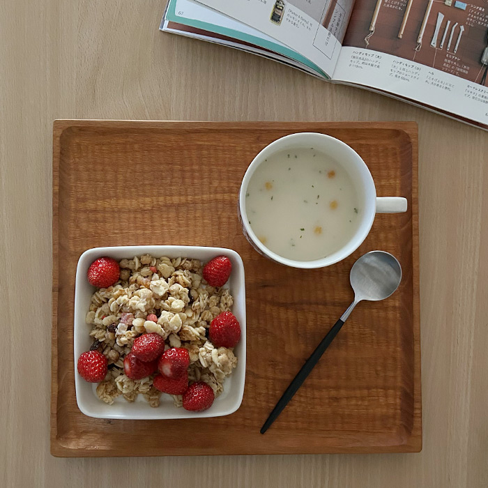 スタッフという贔屓目は一切なしで、プロキッチンオリジナル商品の大ファンです。記念すべき第一号のちょこっとまな板、木のプレート、丸いまな板、カフェトレイも毎日愛用しています。実はこのカフェトレイ、現在販売している商品とは少し仕様が異なります。さっと手に取れるよう底に向かって斜めにカットすることにしたのですが、さて、どこに入れる?となり、届いた試作品を手にあれこれ。結果、現行品のデザインの方がより使いやすく見た目もスッキリ。とのことに。わたしのは商品化に至らなかったけど、何度も手にしているうちに愛着が湧いてきてお買い上げしちゃいました。ひとりの食事はテキトーに済ませがちだけど、このトレイひとつでおひとり様の食事タイムをキリッと整えてくれます。