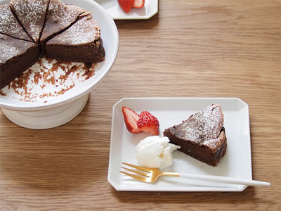 若山曜子さんのレシピ本のスリムケーキ型を使って、レアチーズケーキを作りました。 型は207×57×60mmなので、お皿の余白ギリギリになりますが、パウンドケーキやスクエア型のケーキを乗せるときはいつもこのお皿を使います。お食事を瑞々しく見せてくれるお皿ですが、ケーキもおいしそうに見えます。