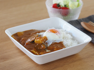 サラダも煮物もなんでも使えてお気に入りのスクエアプレートでカレー。リムの角度と深さがすくいやすくて食べやすいんです。子供は12cmのスクエアプレートで上手に食べてます。おすすめです!
