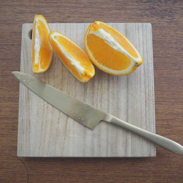 凛とした佇まいに惹かれ、憧れ続けてきたこのナイフ。使うのがもったいないと思いつつ、さっそくオレンジを切りました。果汁がほとんど出ないほどシュっと切れます。卓上でリンゴや梨などの皮をむいたり、スイーツなどを切り分けたりするときに使いやすいサイズです。お気に入りのナイフで気分よくお料理が出来そうなので普段からジャンジャン使っていきたいと思います。