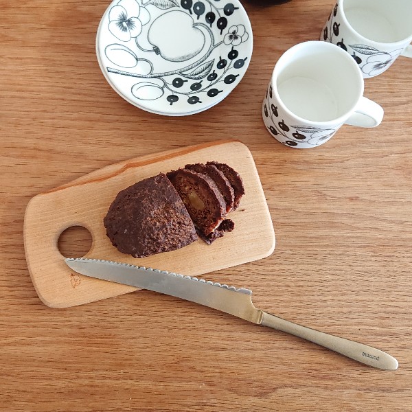 子どもたちが大好きなバナナケーキ。最近は少しでも体にいいものをと思って、グルテンフリーのお菓子作りをすることが多く、このバナナケーキも米粉と黒糖で作りました。 米粉だと割と生地がもっちりしているのですが、このナイフならスッと切れるのでべたついたりポロポロ崩れたりすることもなくきれいに切り分けられます。 見た目が地味になりがちな手作りケーキも、このアンティーク風のナイフで切り分けると素敵にテーブルコーディネートできますよ。