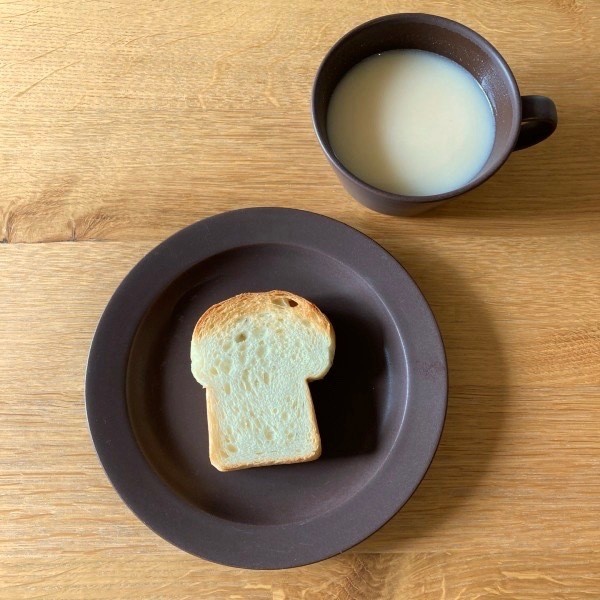 プロキッチン別注のチョコレートブラウンはARABIAの人気シリーズ、Ruska(ルスカ)の色をイメージしたもの。ビターチョコレート色の器は秋冬だけでなくオールシーズン使ってほしいシックな色合いです(撮影がへたっぴで実際の色味とはちょっとちがう感じになってしまいました…)。全体サイズは20センチですが、リム分を差し引くとデザート皿や取り皿としてちょうどいい大きさ。久しぶりに訪れた吉祥寺のダンディゾンの食パンをのせたら、ちょうどよい余白があるサイズ感でした。