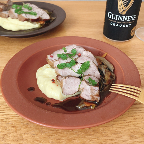 茶系のお皿は、なんとなくデザート向けな印象がありまして、お料理の盛り付けの難易度が高いと思い今まで選んだことがありませんでした。以前、商品撮影に立ち会った際に素敵にお料理が盛られていたのを見て一目惚れし、早速真似してみたのですが、なかなか様になっているのではないでしょうか?今回は豚肩ロースの黒ビール煮をマッシュポテトと一緒に盛り付けてみました。器の色が濃いので、マッシュポテトのクリーム色が良い差し色になりますね。もちろんタルトタタンや、ガトーショコラなどのケーキを乗せてもかわいいですよ♪