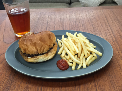 SAKUZANの別注カラーで特に気に入っているのがこのディムグレーです。写真ではだいぶ明るくなっちゃっていますが、ブラックとグレーの中間色といったイメージで何を盛り付けてもサマになります。今日のランチは会社の近くのお店でハンバーガーをテイクアウト。ボリュームたっぷりなのでオーバルLに盛り付けてみました!