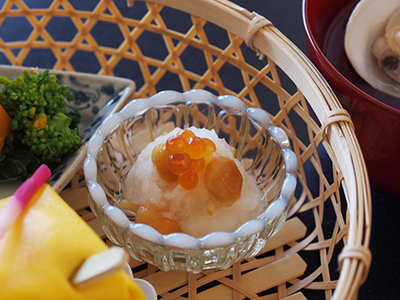 今年のひなまつりは花籠膳。普段のおかずを器の力借りて見栄え良く盛り付けます。花籠膳には様々な形、異素材の器を使うと、全体に立体感、面白みが出てきます。小さなガラスの豆鉢にはさっぱりとしたおろしなめこを盛り付けてみました。豆皿、豆鉢は可愛いので、ついつい増えてしまいますが、ちょこんと盛り付けてお膳に添えれば華を添えてくれること間違いなし。