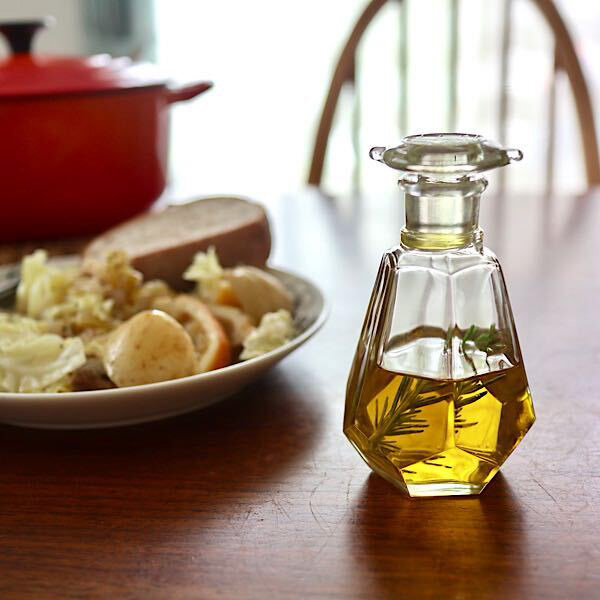 この色味がとても素敵だったので、オリーブオイルを入れてみたいなぁと思い、早速試してみました。思った通り、オリーブオイルの色味が映え、さらに香りづけに入れたローズマリーもアクセントになって卓上に置いても素敵です。肝心の液だれですが、本体に垂れてくることなくしかも蓋がしっかりしまっているので蓋を指で押さえなくてもドバっと出てくる心配はありません。どちらかというとぽたぽたと落ちてくる程度なので、ほんの少しコクが欲しい蒸し料理やサラダにちょっと垂らすのにちょうど良いです。この時期によく作る「春野菜と鶏肉のレモン蒸し」はあっさりしているので、このオイルで風味をつけていただきました。正直、お醤油さしを使う頻度が少ない我が家にはこのサイズは大きすぎるので(我が家は木村硝子店のテーブルソイソースを愛用)このサイズは卓上用のオリーブオイルにぴったりです。
