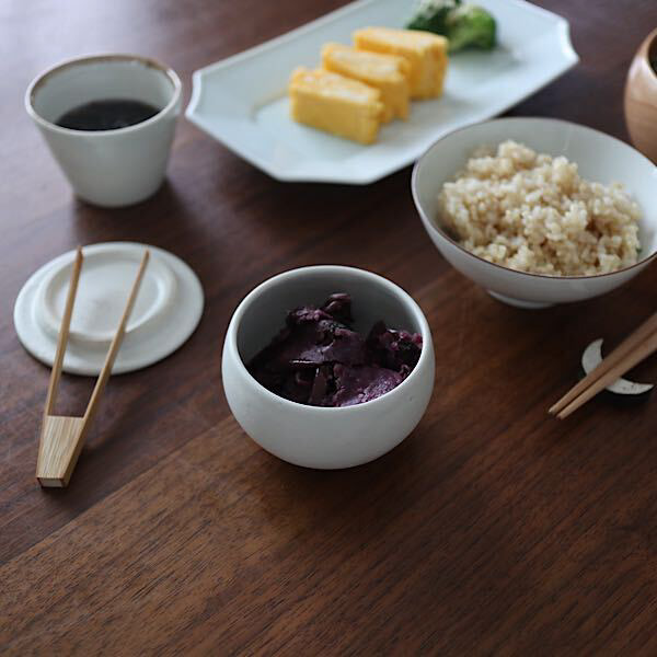 市販の漬け物や佃煮って、容器によっては汁が漏れたりべたついて取り出しにくくなることがよくありましたが、この器に入れたらそんなプチストレスがなくなりました。蓋があるので冷蔵庫で保存でき、見た目も素敵なのでそのまま食卓に出せるのもいいところ。蓋がついてる器ってなかなかないですよね。蓋は平らなので冷蔵庫でも邪魔になりません。食卓に出したときに取り出し用のトングなどが置けるのも便利です。柴漬けを入れていますが色移りもなく、柔らかい雰囲気のある色味はどんな和食器とも合いますよ。