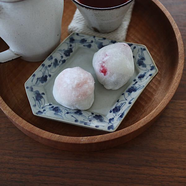 先日行った和菓子屋「果匠 正庵」さんのあんず大福といちご大福。 和菓子に合わせるときはいつも石井桃子さんのこの器を使います。花唐草模様に白い大福が映えておいしそう。ひし形だとそこまで幅をとらないので、丸いお盆に茶器と一緒に載せることもできますよ。